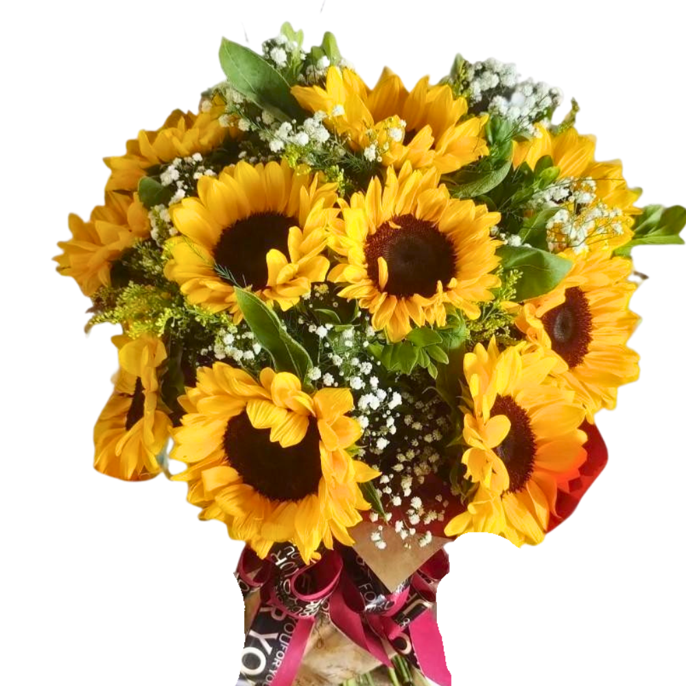Brilhe com a energia vibrante do sol com nosso buquê de 10 girassóis, acompanhados por folhagem verde, é apresentado com elegância em uma embalagem de folha poli dupla face vermelha e papel kraft decorado. O presente ideal para irradiar calor e alegria em momentos especiais. Com girassóis vibrantes e mosquitinho delicado, esse arranjo é perfeito para transmitir felicidade e energia positiva. Ideal para presentear em momentos especiais ou simplesmente para iluminar o dia de alguém.