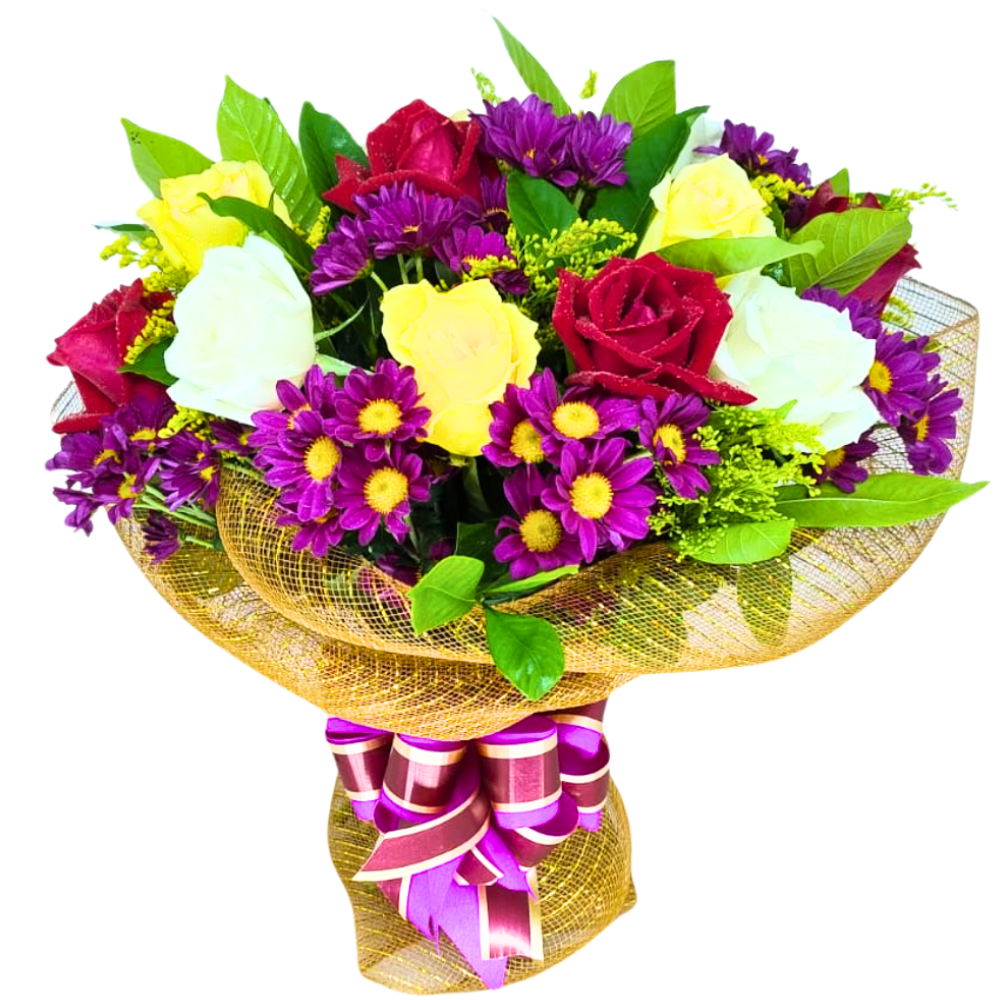 Floricultura Salas Jundiaí apresenta o deslumbrante Buquê Encanto das Rosas e Margaridas. Composto por rosas vermelhas, amarelas e brancas, combinadas com margaridas roxas e folhagens verdes, este buquê é perfeito para momentos especiais. Ideal para presentear em aniversários, comemorações ou para surpreender com elegância. Aproveite a entrega expressa em até 2 horas e frete grátis para Jundiaí e região.