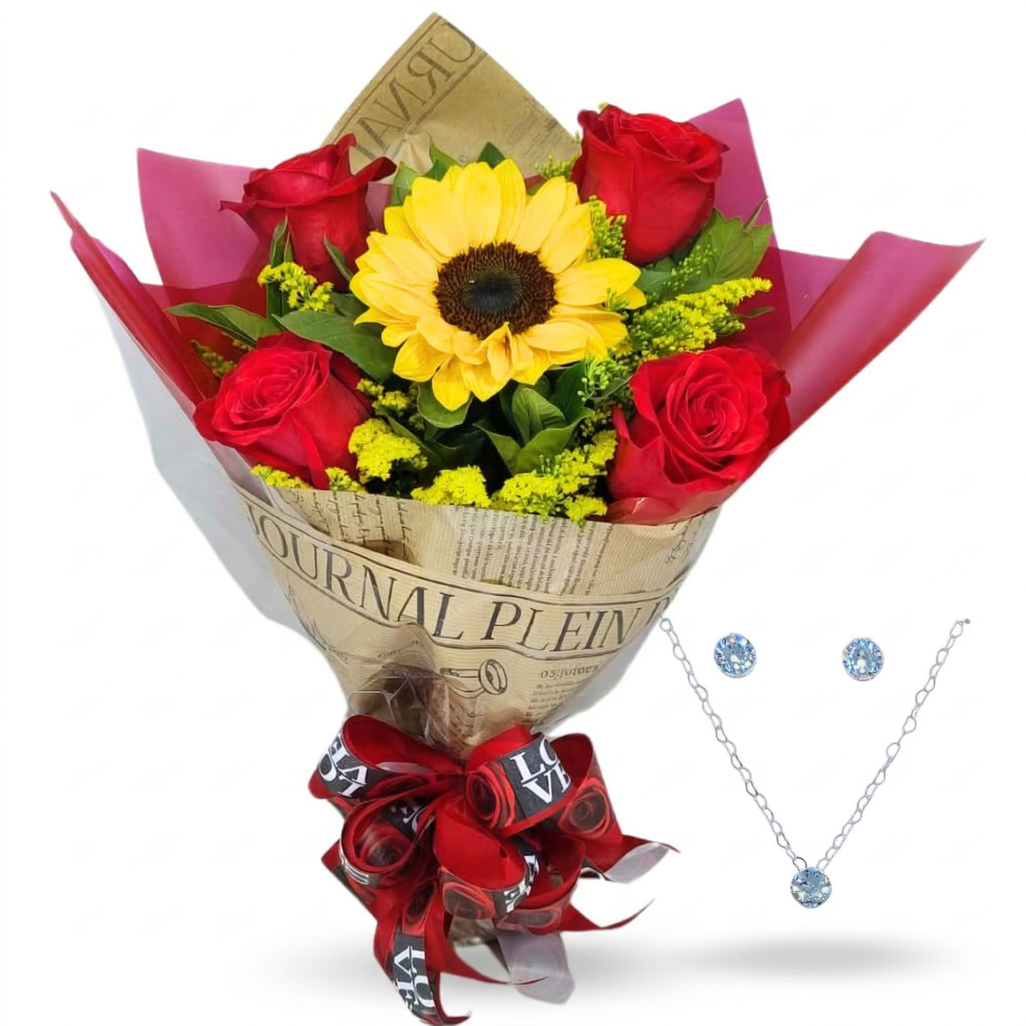 Surpreenda com a beleza singular da natureza com  nosso buquê combina um girassol radiante e quatro rosas abertas, realçadas por folhagem verde, delicadamente embalados em uma elegante folha poli dupla face vermelha e papel kraft decorado, adornados com um laço decorativo para presente. O presente perfeito para encantar com estilo e carinho.